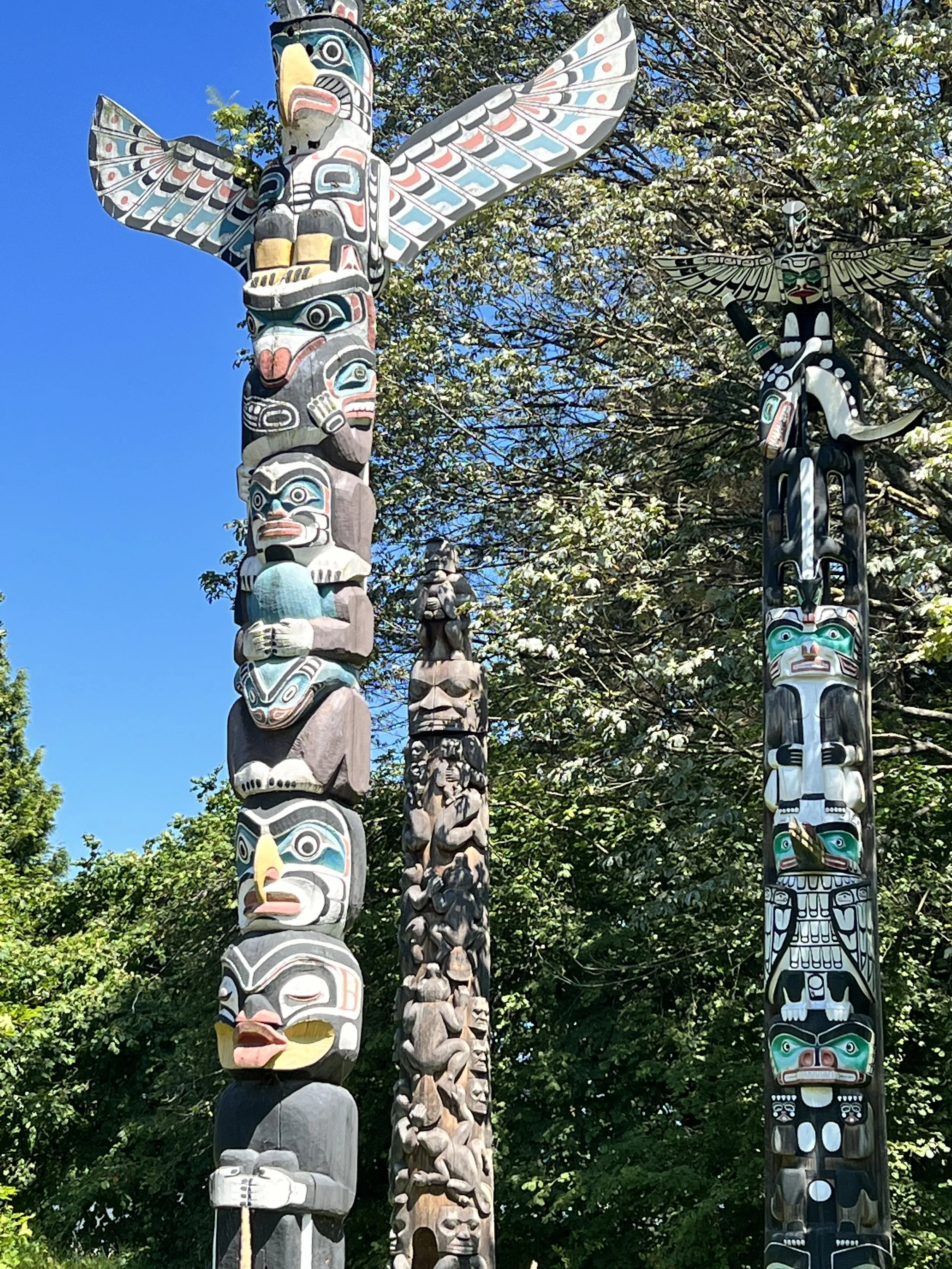 Cardero’s, right on the water, offered beers and fresh oysters. Live music, lively conversations, and Vancouver Pride on full display made it the perfect spot. After lunch, back at Stanley Park, we continued along the seawall, passing Brockton Point Lighthouse and reaching the totem poles, grouped like an open-air museum, with signs explaining their history.