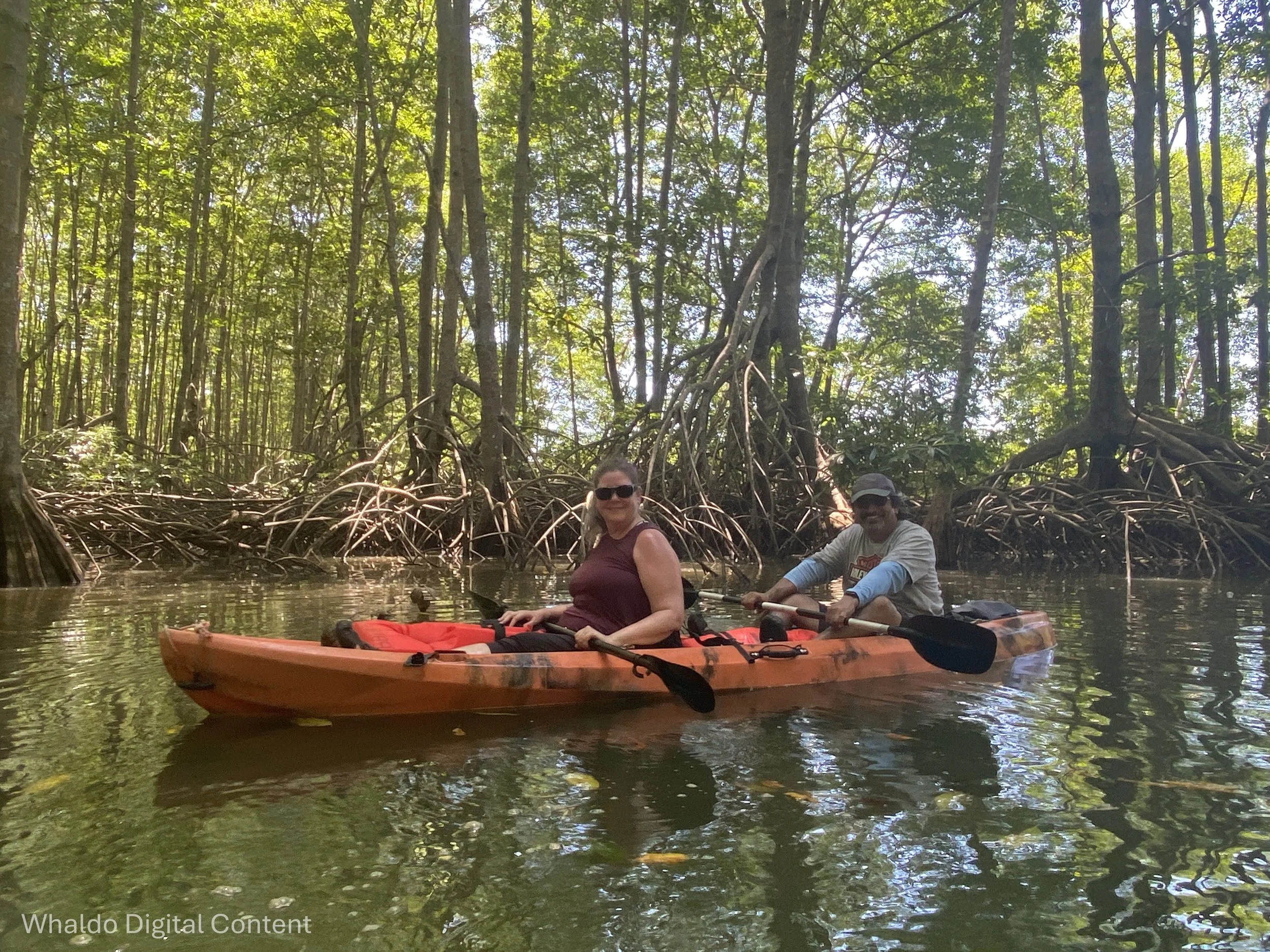 Once there, we met our guide, Michael, from the Dolphin Tour company. As he prepared the kayak and gear for us, we watched a family of beautiful Scarlet Macaws soaring overhead, their bright feathers a stunning contrast against the deep green of the mangroves.