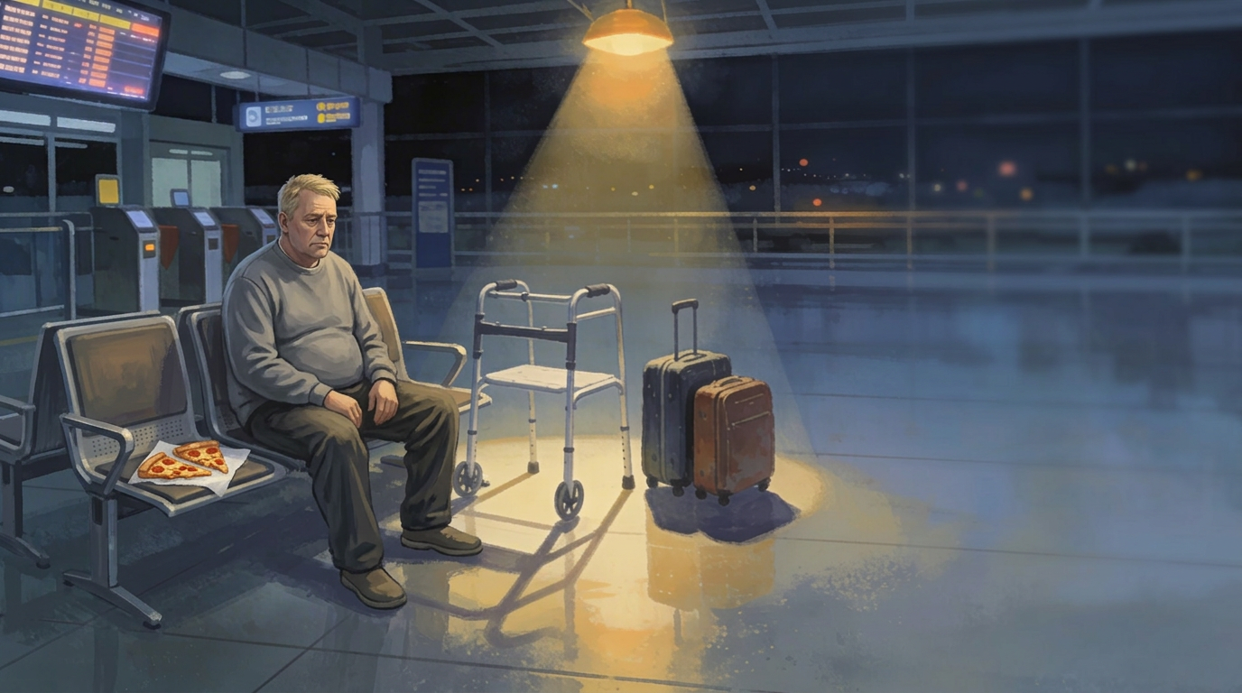 He sat in the Phoenix terminal with two rolling suitcases and his walker positioned in front of him like a barrier. The café was closed. He rationed the snacks he had packed, counting them out in his head so they would last. He limited his water so he would not have to wrestle his belongings into a restroom stall and risk someone walking off with what little he had.